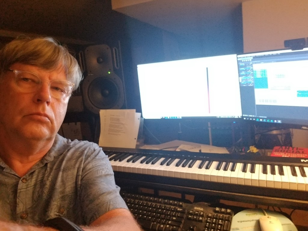 I’m just getting started with this site, so I’d love feedback — leave comments. Below is my workstation — a hand-built Digital Audio Workstation (Windows PC) with two monitors, an M-Audio Keystation88 as a MIDI controller, and one of the two speakers with which I listen to it all. I’ll post more about the technicals later in this blog.