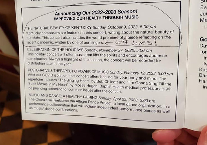 It boggles the mind. I am a new composer with only three works under my belt, but in the past week I saw the 2022-23 concert season programs for the Lexington Chamber Chorale presented to its board for approval by music director Dr. Gary Anderson, and my 20-20: A Chorale Suite is on the first program, Sunday, Oct. 9, 5:00 PM! In all fairness, I have to admit that I sing in the chorale, and also sit on the board, but I have been pretty scrupulous about not being my own promoter — I only sent Dr. Anderson a link to the online delivery on my website, and included the scores themselves. He agreed to do the work on that input.