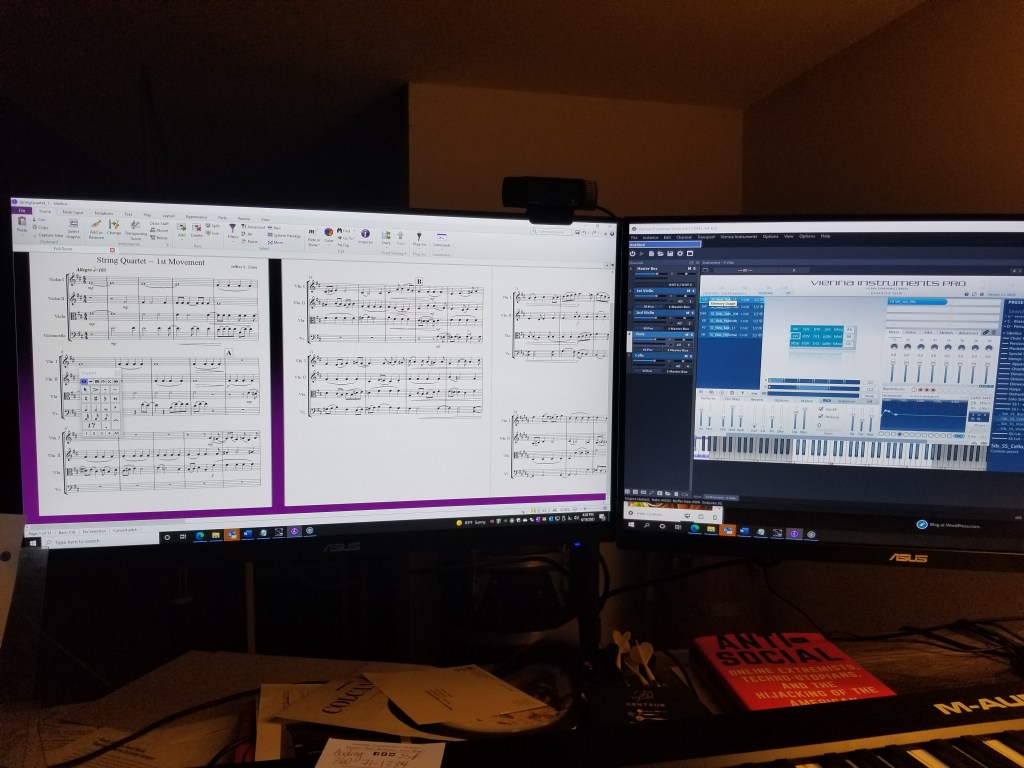 Below is a picture of my computer displays. On the left is the score. On the right is the display of the various “virtual instrument” controls. When I play the score back at left, the notes, and all of the things impacting their performance (dynamics, tempo, performance styles like staccato, etc.) are fed to the “instruments” at right, which call up all of the samples required to “play” the notes. I could probably spend the next 10 years just trying to better master the controls these “instruments” provide. I’d rather simply write, so the Sibelius exports you hear on this website are pretty much what happened “out of the box.” It’s good enough to be listenable, most certainly good enough to support the creation process.