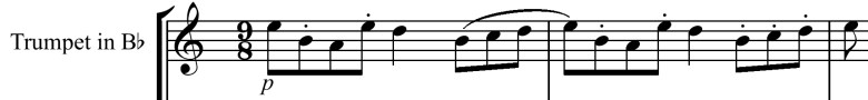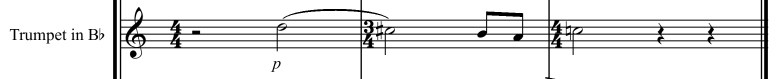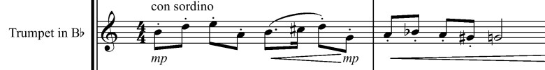 If you compare this fragment to the original theme above, you’ll find it’s the same — sorta. All rhythm has been stripped out, as well as a part of measure 3 and most of measure 4. I’ve also taken the fragment and crammed it into an odd meter (9/8, grouped 4, 2, 3). This figure serves as an accompaniment for a melody carried by the trombone initially. You’ll hear all that on the page with the full variation.